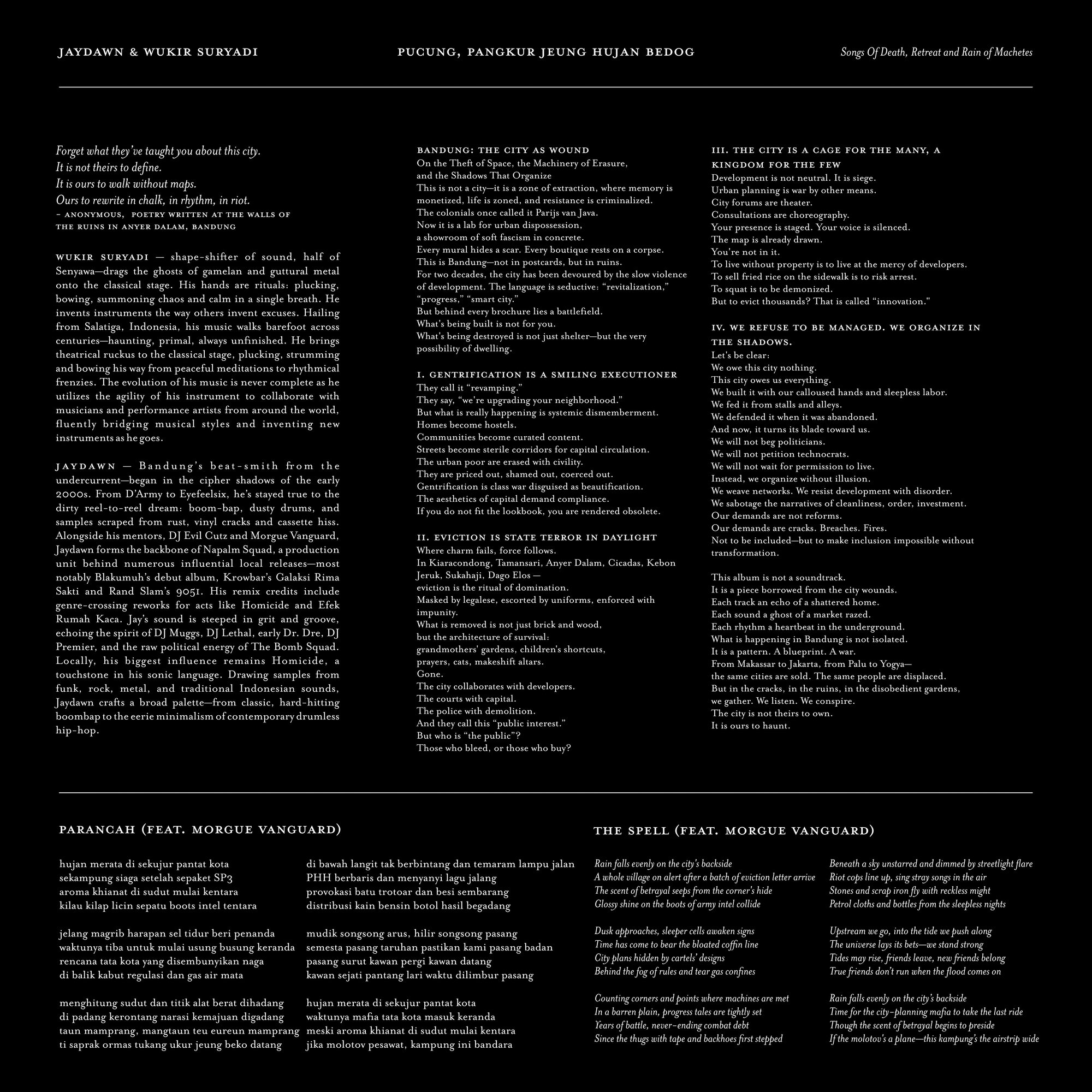 This collaboration was forged not in comfort, but in contradiction. Two of Indonesia’s most uncompromising underground figures—Jaydawn, Bandung’s rogue boom-bap architect, and Wukir Suryadi, the genre-eviscerating shapeshifter behind Senyawa—collide in a visceral new project that defies category and disobeys silence. Their debut collaboration is not just an album—it is a rupture, an aural pamphlet, a ghost howl from the dance hall beneath the rubble of a city being sold. Crafted in the sacred noise labs of Studio Tingkir (Salatiga) and Cutz Chamber (Bandung), this 10-track release fractures hip-hop, ambient drone, Bambu Wukir metallurgy, and industrial echoes into a palette of resistance. One war-song, “Parancah”, features a searing verse from Bandung’s own acid-spitter, Morgue Vanguard. Titled “Pucung, Pangkur Jeung Hujan Bedog” (translated as “Songs of Death, Retreat, and Rain of Machetes”), this project is both elegy and uprising.
